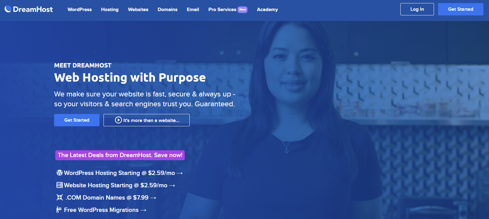 Meet DreamHost Web Hosting with Purpose they make sure your website is fast, secure & always up so your visitors & search engines trust you. DreamHost helps you succeed and grow your website faster by using DreamHost as your foundation. With over 20 years of hosting experience, they focus on successful sites for web designers, developers, bloggers and online businesses. Their community and support helps you create a website fast and easy.